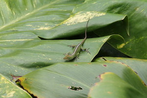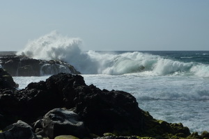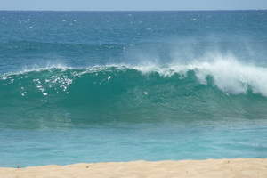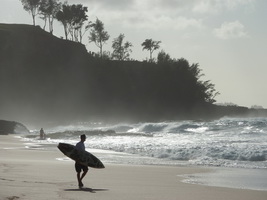 Gemütliches Frühstück um 8.30 Uhr: Pancakes mit Bananen drin und Papaya. Wir fahren die Westküste entlang nach Süden. Dann vor Kapaa die Olohena Rd. , Hauiki und Waipola Rd ins Landesinnere. Schöne Landschaft, aber alles bebaut. Zurück über die Opeaka'a Falls, ein schöner Doppelwasserfall. auf der anderen Seite der Blick auf Wailua River. Dann zum Strand Lydgate Beach Park. Da gibt es ein abgeteiltes Schwimmbecken, denn das Meer hat hier starke Brandung und es liegt viel Treibholz herum. Dann machen wir in in Kapaa einen Einkaufsbummel. Sonja findet schöne Stoffe im Quiltshop. Zu Mittag essen wir im urigen Cafe Coco. Das sieht recht rustikal aus und wer im Freien sitzt, muß mit Moskitos rechnen. Aber das Essen ist sehr lecker! Ich hatte ein Gumbo (New Orleans Seefood Suppe) uns Sonja ein Ahi Sandwich. Um 14 Uhr waren wir zurück im B+B. Um 16 wieder los Richtung Secret Beach. Kurz hinter Kilauea Richtung Princeville, rechts in die 1st Kalihiwai Road einbiegen, dann gleich die erste Schotterstraße rechts runter. Am Ende parken und ca. 10 Min. einen steilen Pfad durch den Wald zum Strand runter gehen. Da wartet ein toller Surfstrand, nix zum Baden, aber landschaftlich einer der schönsten Strände. Nach rechts Blick aufs Kilauea Lighthouse. Wir sind lange nur dagesessen und haben den den Surfern zugeschaut. Die Jungs waren wirklich gut. Nach links in den Felsen solls Lava Pools zum Baden gehen, mir waren die Felsen auf dem Weg dorthin zu rutschig (mit Algen überzogen, sehr hohe Wellen!) |