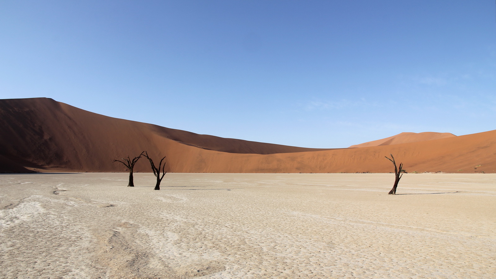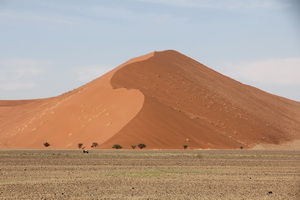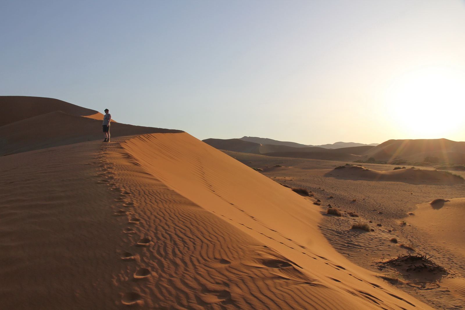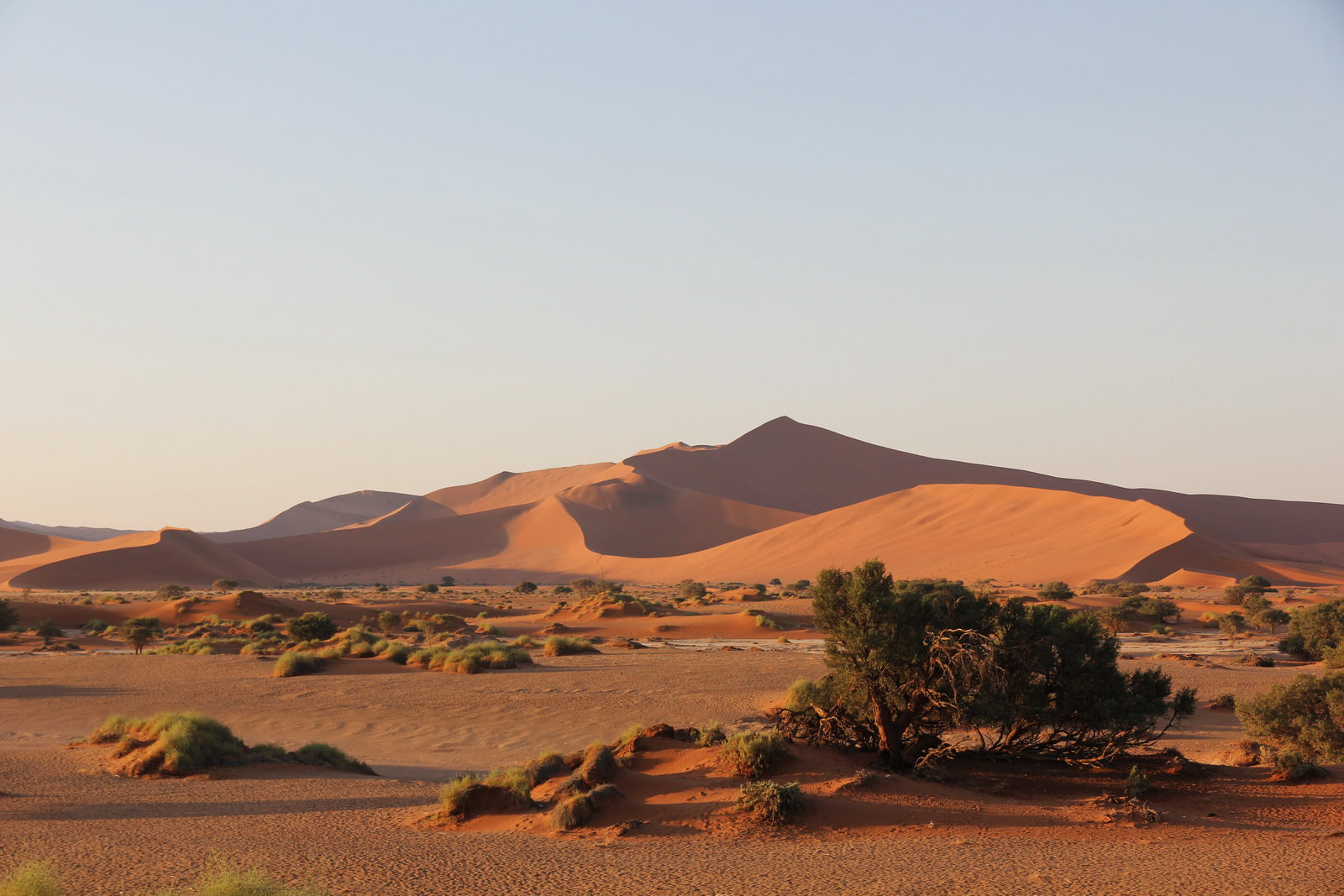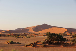 das fahle Morgenlicht ab. An Düne 45 (45 km ab Sesriem) sind schon