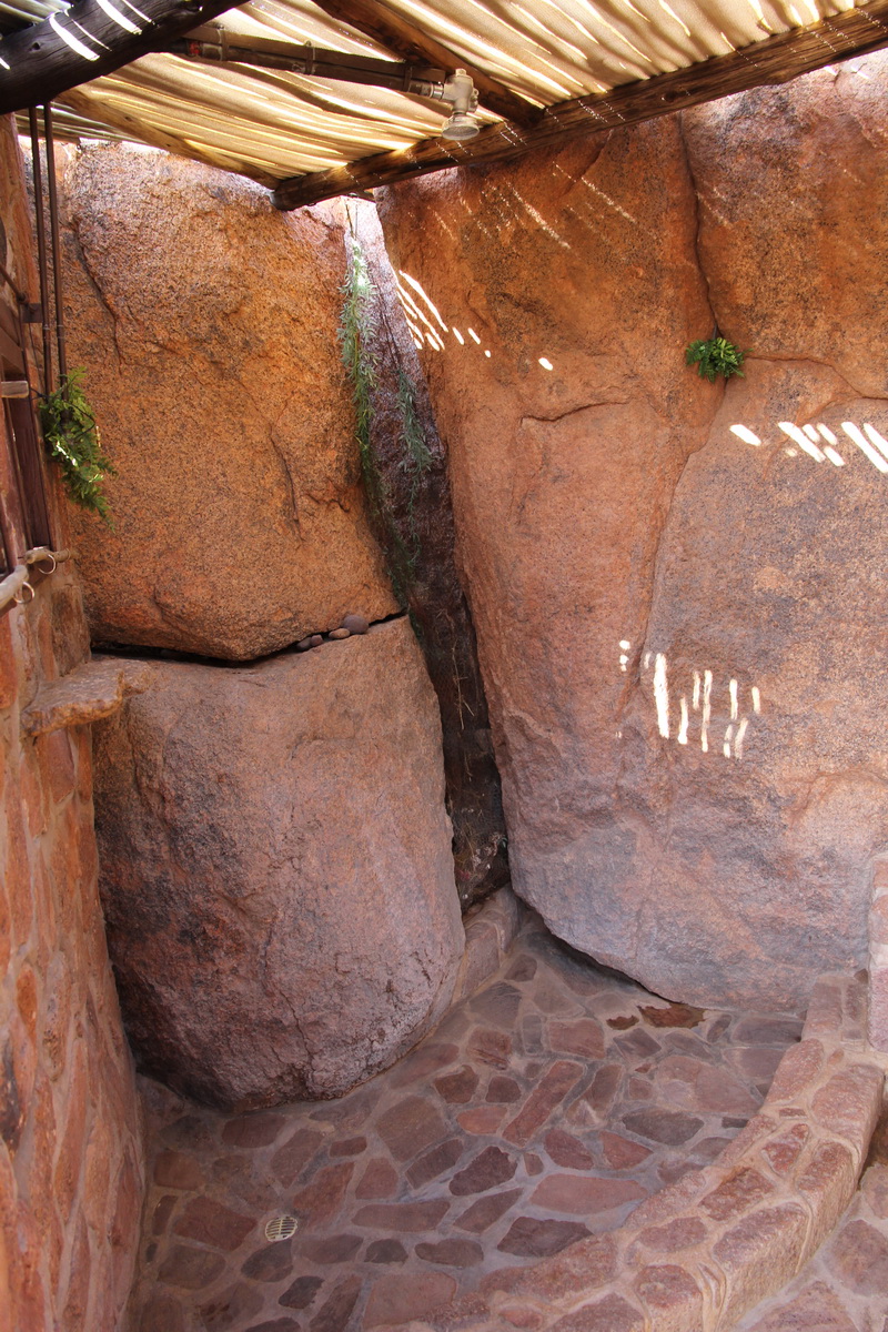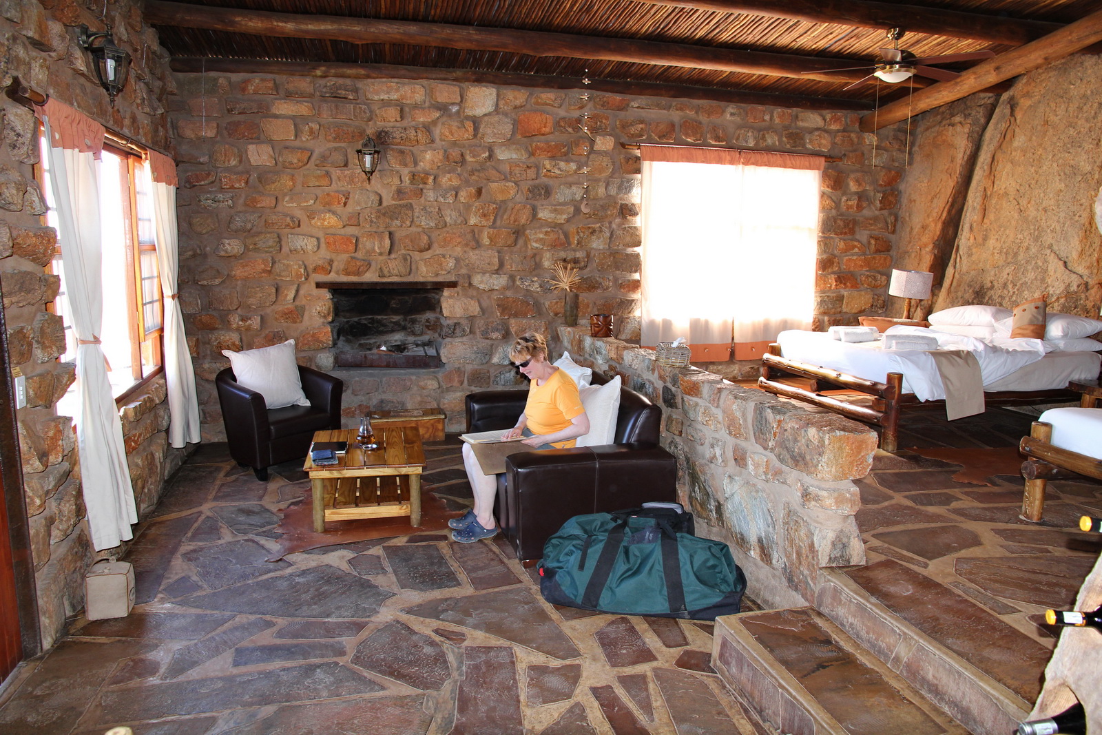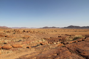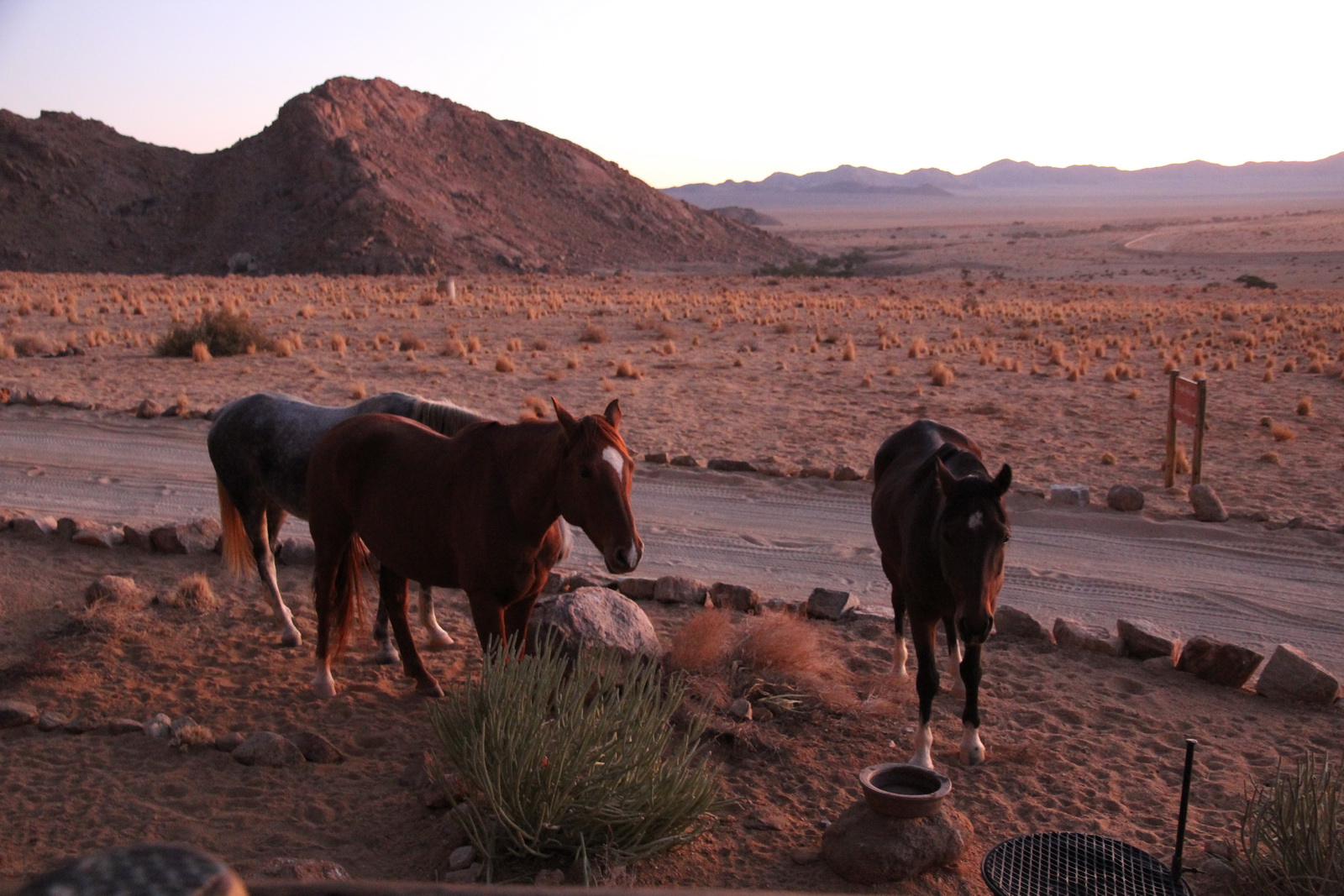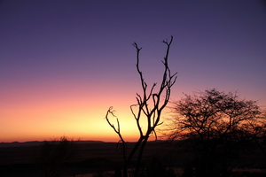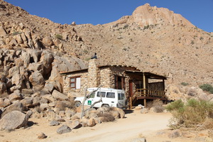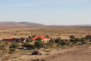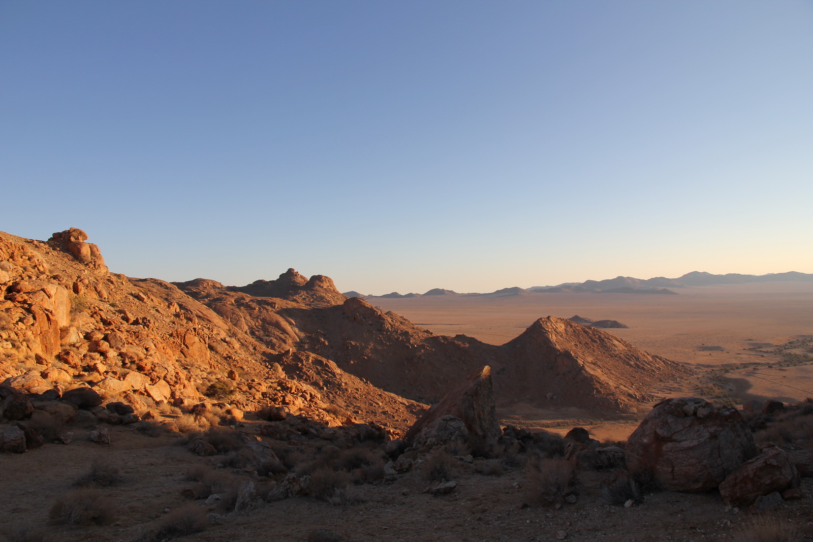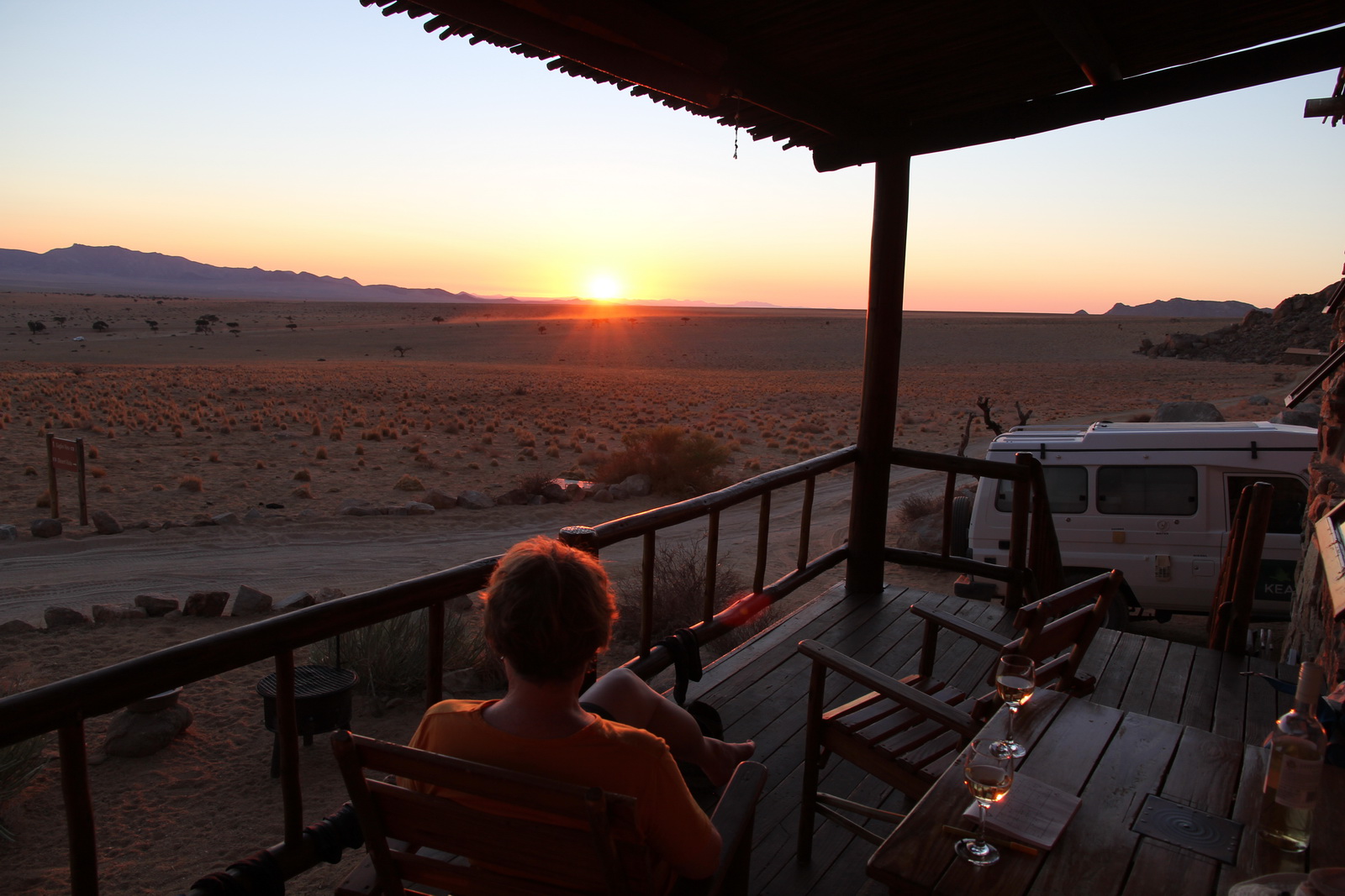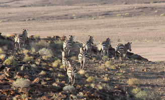 Mit der Sonne aufgestanden, und um 8 Uhr fahren wir die 5 km zum Sesriem Canyon und gehen runter. Es ist noch angenehm kühl. Wir gehen canyonaufwärts, da soll Wasser sein. Die Canyonwände sind bizarr, überhängend, voller Höhlen. Am Ende verhindern heruntergestürzte Felsen das Weiterkommen. Kein Wasser! Wir drehen um und gehen über den Einstiegspunkt hinaus den Canyon hinunter. Hier wird der Canyon breiter, die Sonne scheint rein. Da könnte man währscheinlich noch weit wandern, ab es kommen lästige Fliegen, also drehen wir um. Kurz, aber lohnend. Im Nationalparkbüro holen wir uns noch ein Permit für die Welwitschia-Ebene am Montag, 90N$. Im Tankstellenladen noch 5 l Wasser kaufen, hatten wir gestern vergessen. Der Laden ist viel besser sortiert, als der im Park. Dann auf die Strasse, erst C27, dann C19 Richtung Walvis-Bay. Die ist meist in gutem Zustand, nur in der Mitte ist ein schlechtes Stück, an dem gerade gearbeitet wird. In Solitaire gibt es ein uriges Roadhouse mit angeschlossener Bäckerei. Wir kaufen verschiedene süße Stückle und um 11 Uhr sind wir an der Rostock Ritz Lodge. Die Lage des Campingplatzes ist sehr schön, mit weitem Blick, besonders von der Grillterasse. Es gibt aber fast keinen Schatten. Wir ziehen uns unter das Dach der Campküche zurück, da kann man's aushalten. Die 4 Plätze sind recht eng aufeinander, aber wir sind die Einzigen, so stört das nicht. Der Name Rostock hat nichts mit der deutschen Stadt zu tun, sondern mit dem Rooistock, einem Vulkanberg in der Nähe. Pünktlich um 15:45 Uhr werden wir vom Camp abgeholt und zur Lodge gefahren. Von dort machen wir den Sundowner-Walk. Hoch auf den Hügel hinter der Lodge, mit toller Aussicht auf die umliegenden Ebenen und Berge. Es ist schon kühler, also angenehmes Wandern. Ich scheuche eine Horde von 15 Bergzebras auf, es gelingen ein paar tolle Fotos von der davonstiebenden Herde. Auf dem Rest der Wanderung sehen wir sie immer wieder, aber sie bleiben in sicherer Entfernung. Zurück in der Lodge genießen wir von der Terasse aus einen farbenprächtigen afrikanischen Sonnenuntergang bei kühlem Bier vom Fass und unterhalten uns nett mit den Betreibern der Lodge und anderen Gästen. Dann gehts zum Dinner: Avocado Ritz und Knoblauchbrot als Starter, dann Springbockfilet und Wildgeschnetzeltes, sehr lecker! Nach dem Essen gibts einen Taxiservice zurück zu unserem einsamen Campingplatz. Ein bissle Sterne gucken (wird jede Nacht besser) dann ins Bett. |