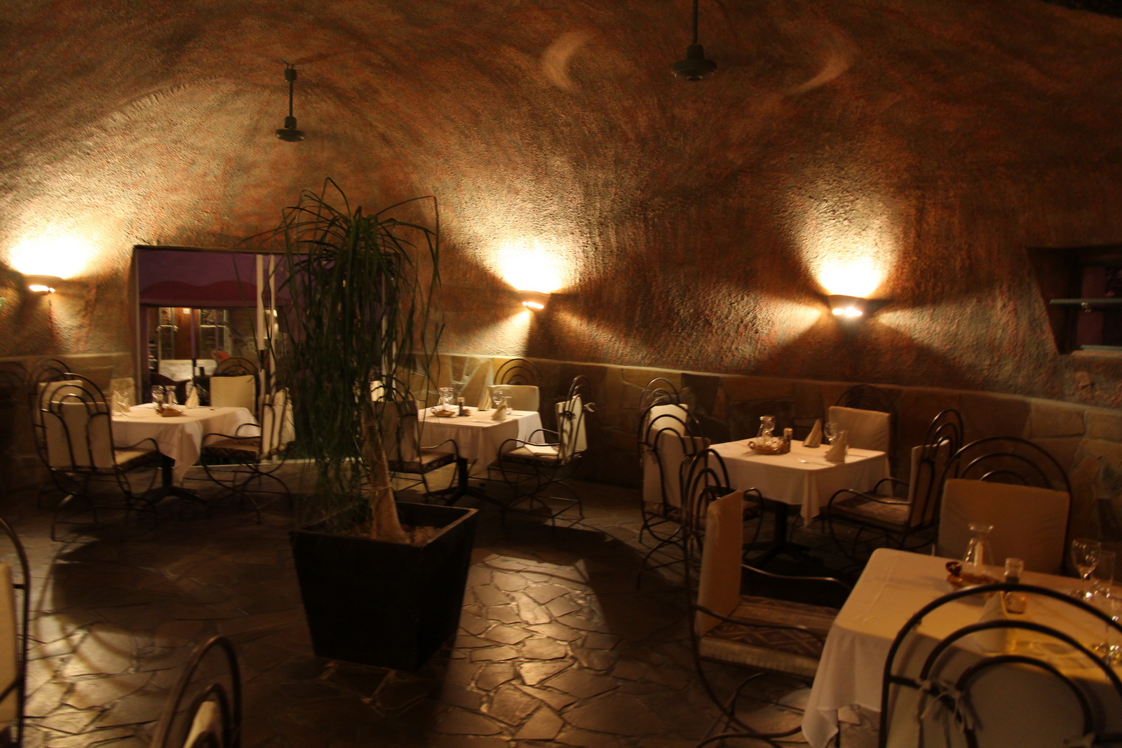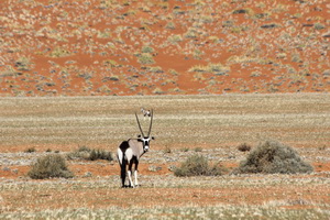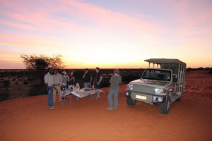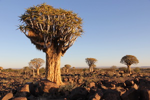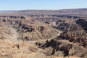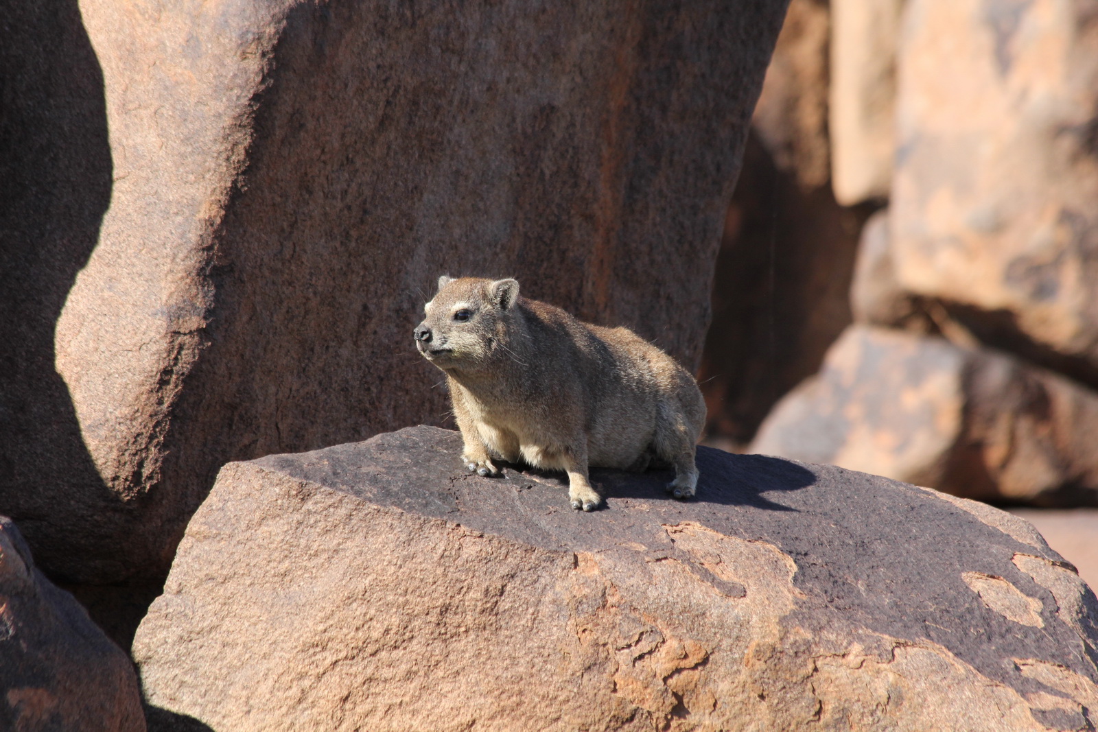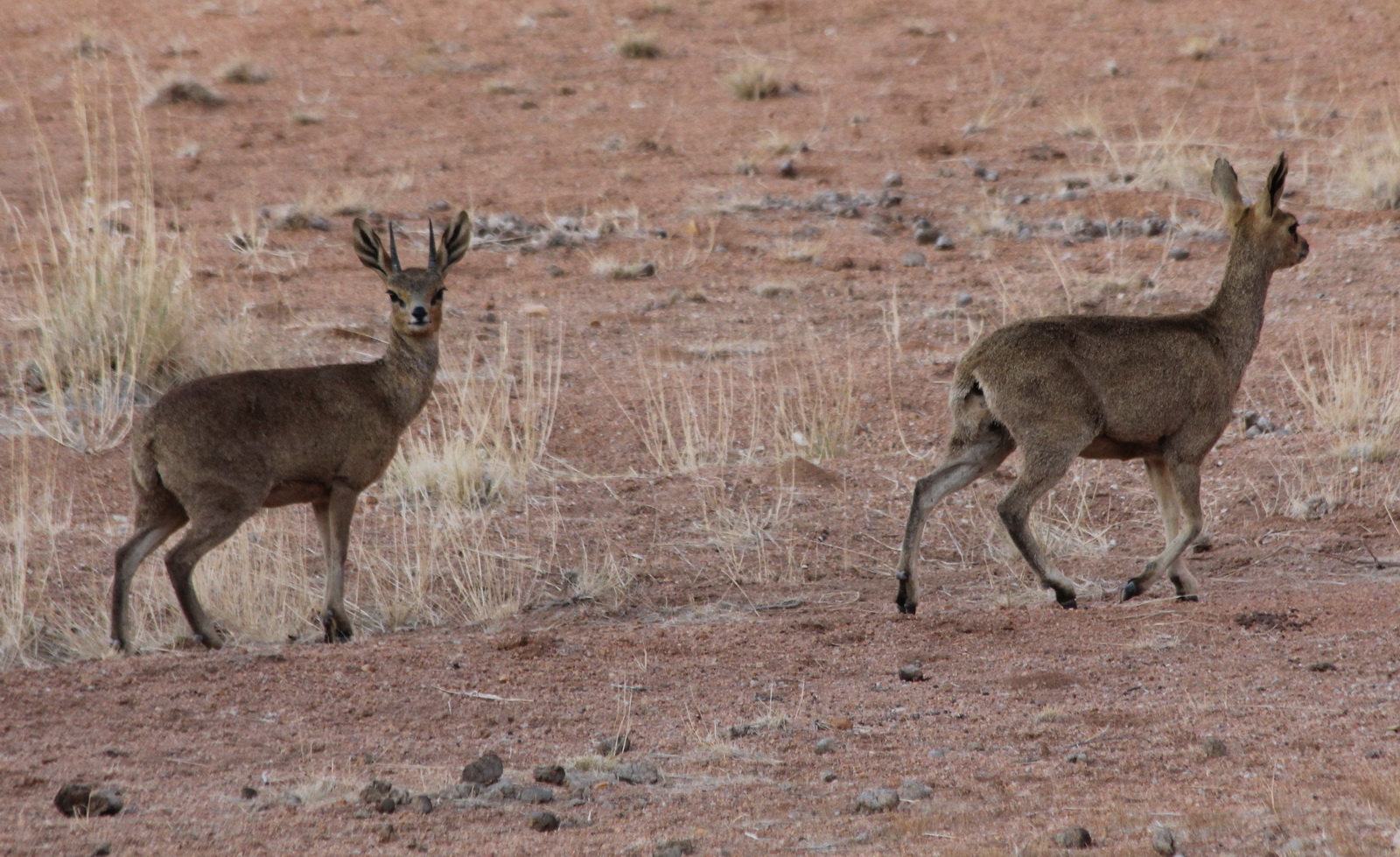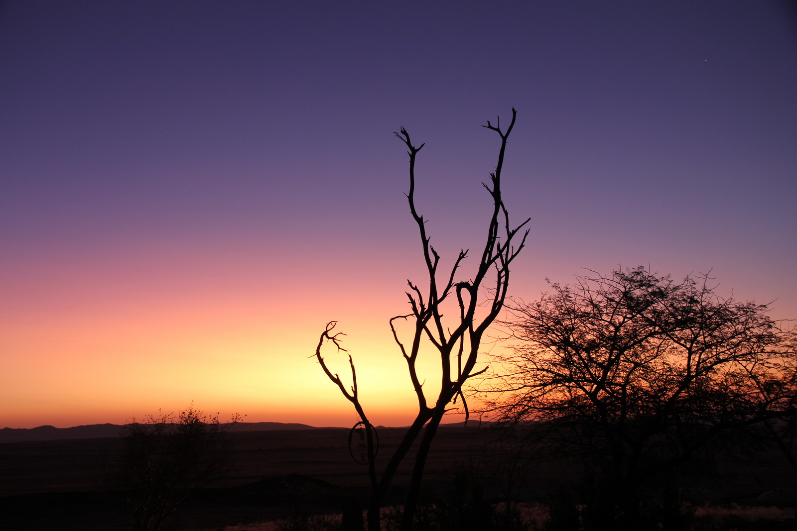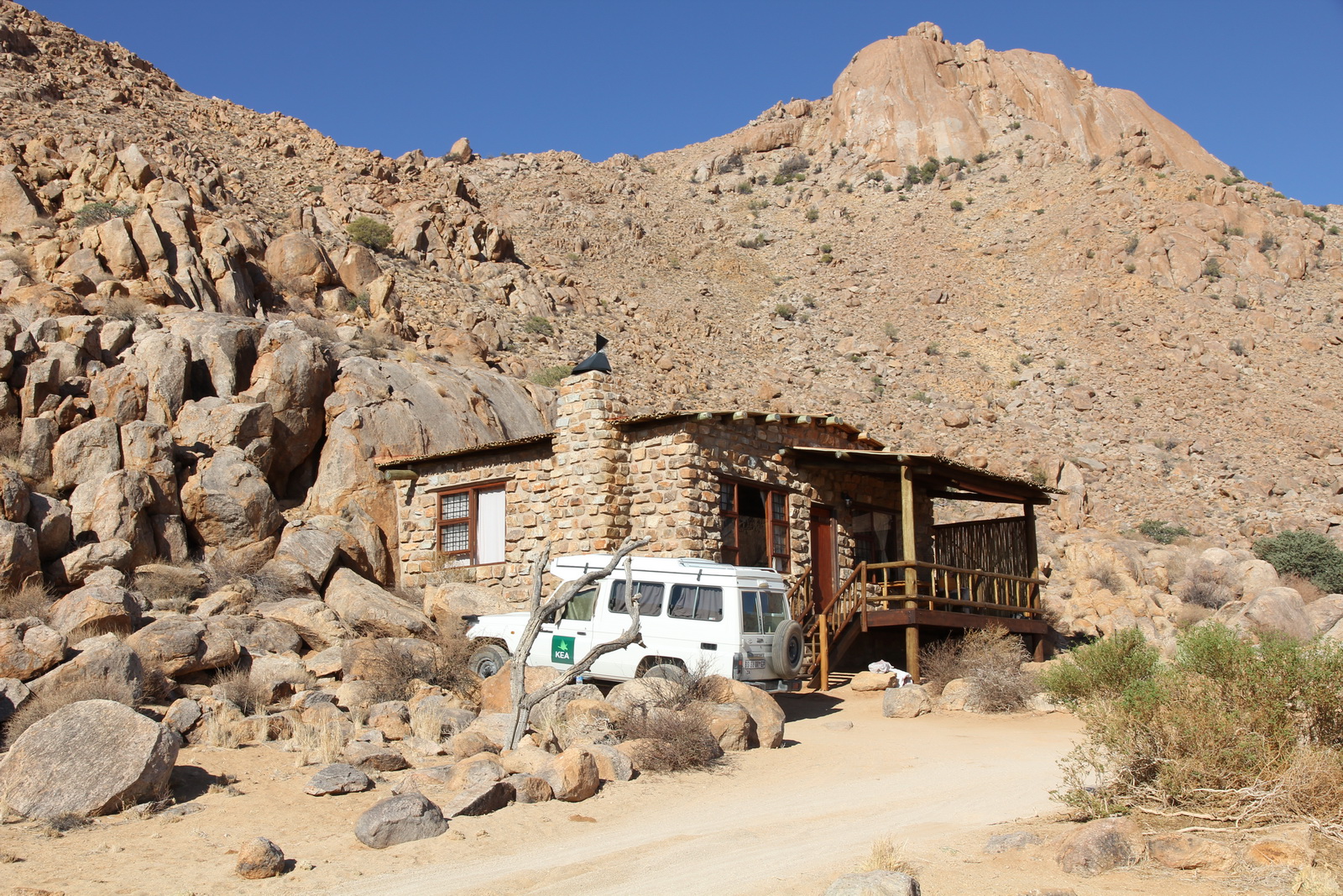 Mit der Sonne aufgestanden, und um 8 Uhr fahren wir die 5 km zum Sesriem Canyon und gehen runter. Es ist noch angenehm kühl. Wir gehen canyonaufwärts, da soll Wasser sein. Die Canyonwände sind bizarr, überhängend, voller Höhlen. Am Ende verhindern heruntergestürzte Felsen das Weiterkommen. Kein Wasser! Wir drehen um und gehen über den Einstiegspunkt hinaus den Canyon hinunter. Hier wird der Canyon breiter, die Sonne scheint rein. Da könnte man währscheinlich noch weit wandern, ab es kommen lästige Fliegen, also drehen wir um. Kurz, aber lohnend. Im Nationalparkbüro holen wir uns noch ein Permit für die Welwitschia-Ebene am Montag, 90N$. Im Tankstellenladen noch 5 l Wasser kaufen, hatten wir gestern vergessen. Der Laden ist viel besser sortiert, als der im Park. Dann auf die Strasse, erst C27, dann C19 Richtung Walvis-Bay. Die ist meist in gutem Zustand, nur in der Mitte ist ein schlechtes Stück, an dem gerade gearbeitet wird. In Solitaire gibt es ein uriges Roadhouse mit angeschlossener Bäckerei. Wir kaufen verschiedene süße Stückle und um 11 Uhr sind wir an der Rostock Ritz Lodge. Die Lage des Campingplatzes ist sehr schön, mit weitem Blick, besonders von der Grillterasse. Es gibt aber fast keinen Schatten. Wir ziehen uns unter das Dach der Campküche zurück, da kann man's aushalten. Die 4 Plätze sind recht eng aufeinander, aber wir sind die Einzigen, so stört das nicht. Der Name Rostock hat nichts mit der deutschen Stadt zu tun, sondern mit dem Rooistock, einem Vulkanberg in der Nähe. Pünktlich um 15:45 Uhr werden wir vom Camp abgeholt und zur Lodge gefahren. Von dort machen wir den Sundowner-Walk. Hoch auf den Hügel hinter der Lodge, mit toller Aussicht auf die umliegenden Ebenen und Berge. Es ist schon kühler, also angenehmes Wandern. Ich scheuche eine Horde von 15 Bergzebras auf, es gelingen ein paar tolle Fotos von der davonstiebenden Herde. Auf dem Rest der Wanderung sehen wir sie immer wieder, aber sie bleiben in sicherer Entfernung. Zurück in der Lodge genießen wir von der Terasse aus einen farbenprächtigen afrikanischen Sonnenuntergang bei kühlem Bier vom Fass und unterhalten uns nett mit den Betreibern der Lodge und anderen Gästen. Dann gehts zum Dinner: Avocado Ritz und Knoblauchbrot als Starter, dann Springbockfilet und Wildgeschnetzeltes, sehr lecker! Nach dem Essen gibts einen Taxiservice zurück zu unserem einsamen Campingplatz. Ein bissle Sterne gucken (wird jede Nacht besser) dann ins Bett. |