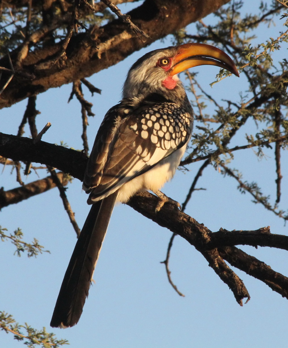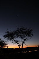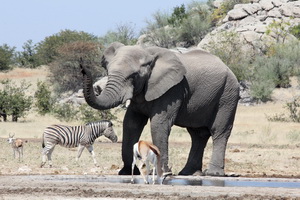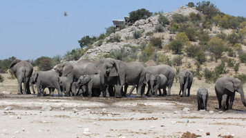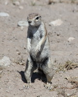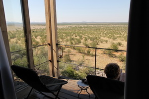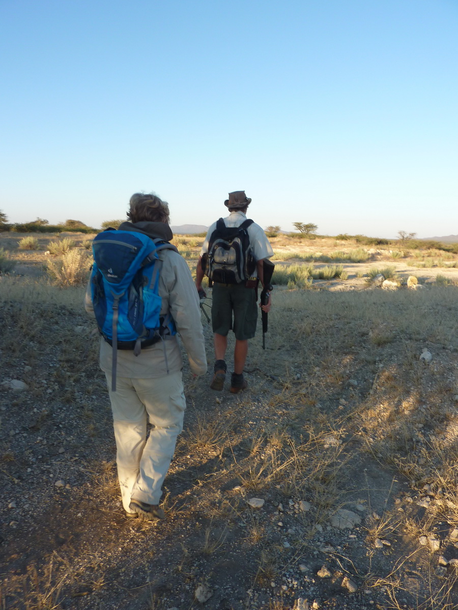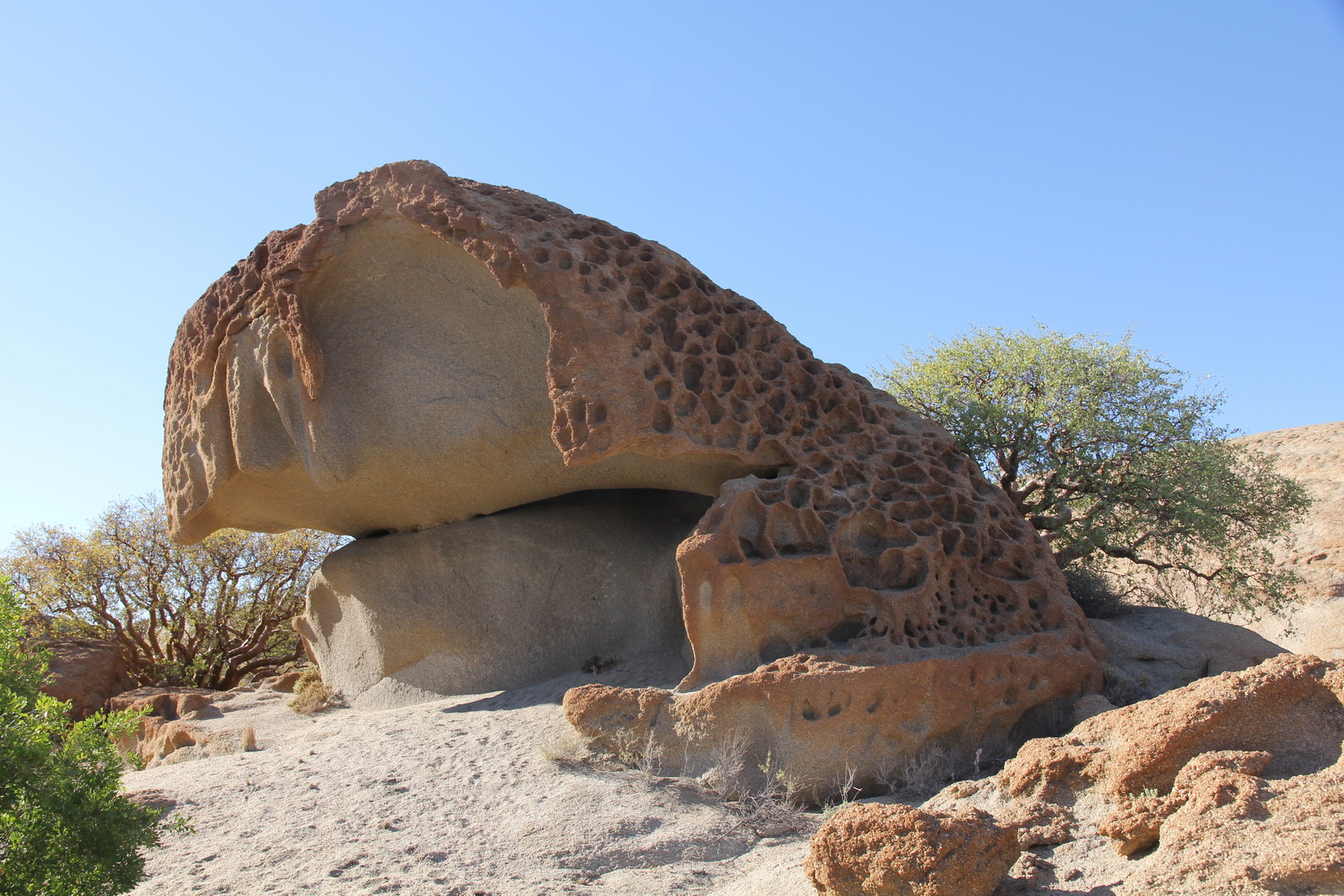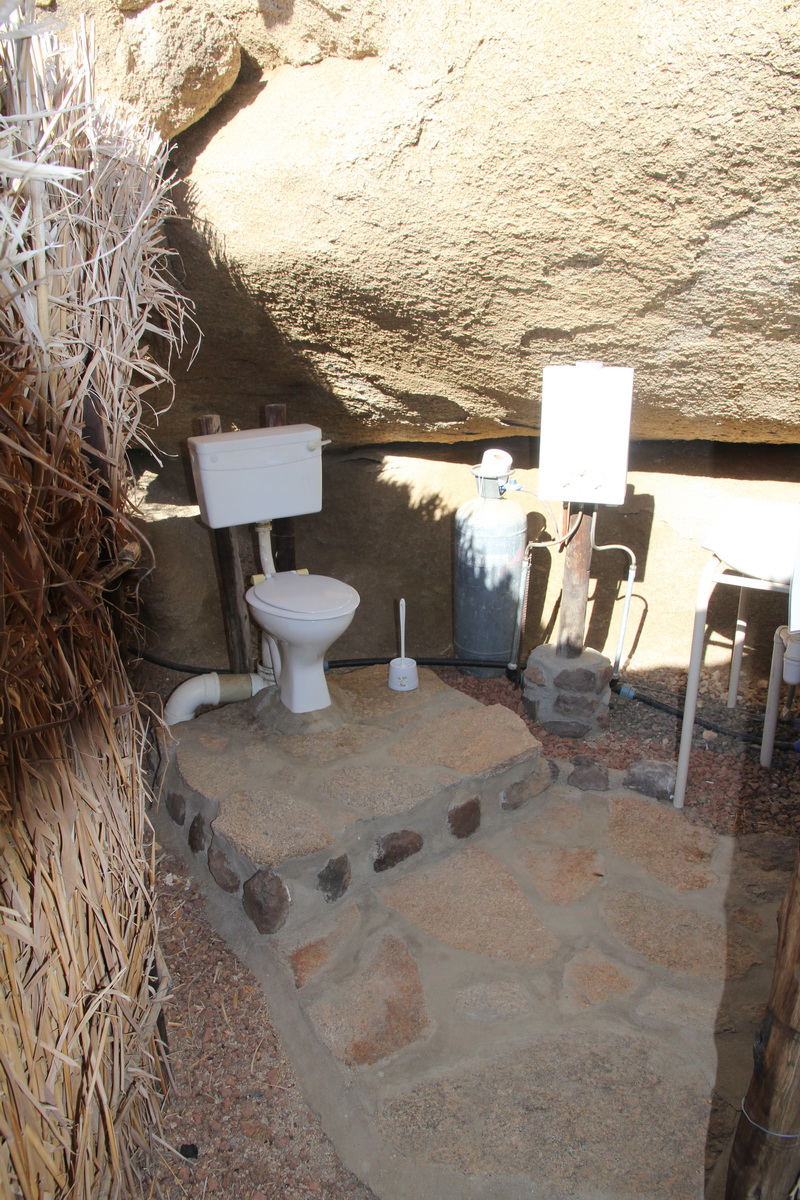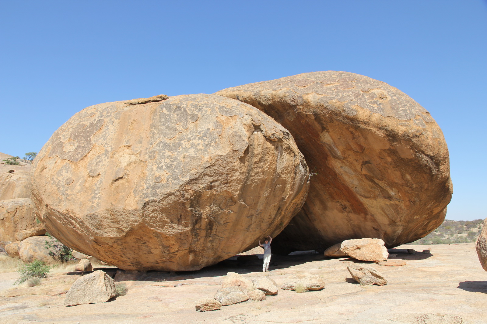 Die Nacht war warm, erst gegen Morgen kam etwas Wind auf. Früh aufgestanden, heute haben wir Programm. Wir fahren Richtung Usakos, erst auf schmalen Farmland-Pad, dann auf der frisch gerichteten D1914. Wir brauchen für die 90 km 2 Stunden und das einzige Fahrzeug, das uns begegnet ist der Grader, der die Strasse so schön planiert. In Usakos müssen wir uns erst orientieren. Am Bahnhof steht eine alte Schmalspurdampflok. Und es kommt doch tatsächlich mal ein Güterzug vorbei. Dann gehts auf die D1935/1937 zur Farm Ameib. Dort befindet sich die Bulls Party eine Felsenformation. Tipp von Thomas F. Schon die Fahrt dorthin ist wunderschön. Im Hintergrund das eindrucksvolle Erongo-Gebirge. Die BullsParty ist fantastisch, ich habe noch nirgends solche riesigen Felskugeln gesehen. Manche balancieren auf nur 1-2 m breiten Auflagepunkten. Wir wollen auf einer schönen Bank im Schatten Mittag machen, Sonja setzt sich schon mal hin und ich gehe die Sachen fürs Vesper aus dem Auto holen. Als ich gerade wieder los will, kommt sie mir entgegen. Ich geh da nicht mehr hin, da ist ein Leopard im Gebüsch. Da traue ich mich dann auch nicht mehr hin, so einen Leoparden würde ich ja gerne sehen, aber lieber vom sicheren Auto aus. Also gibts halt ein paar Nüsse und Salzcräcker im Auto, dann tuckern wir schön langsam zurück, Auto-wandern. Wir fahren auf den Pads D2306+D2315+D2316 um das Erongo Gebirge herum zum Erongo Plateau Camp. Die letzten paar Kilometer zum Camp sind steinig, holprig und langsam. Israel, der Campingwart, zeigt uns den Platz und verkauft uns Feuerholz. Den Rest des Tages ist Relaxen bei toller Aussicht angesagt. Abends gibts Rinderflilet und Minikürbisse in Alufolie vom Grill. Dazu ein Swartland CabSauv/Merlot aus der Flasche, viel besser als der Kartonwein. An die beleuchtete Wassertränke kommen heute nur Oryx. Immer noch T-shirt-Temperaturen in der Nacht. Wir sind alleine auf dem Campingplatz. Am nächsten Tag gehts um 7:30 Uhr auf den Wanderpfad hinter