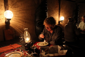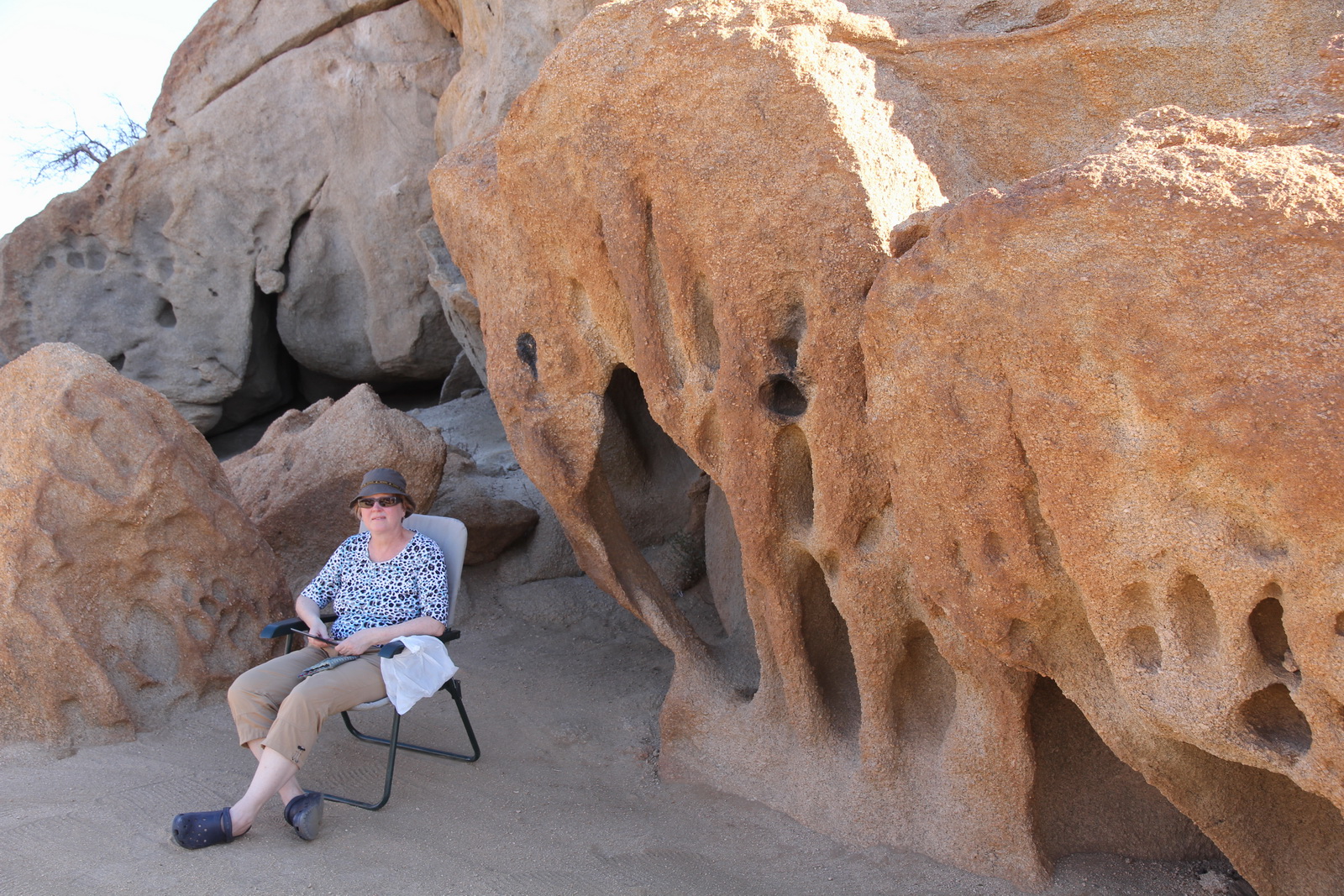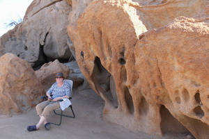 Anschließend noch zur Tankstelle und volltanken. Den nächsten Tag verbringen wir auch hier, da dürfen wir etwas länger schlafen. Nach dem Frühstück wird noch eine Ladung Wäsche gewaschen und aufhgehängt, sie wird in 2 Stunden trocken. Dann gehen wir auf eine Wanderung durch die Felsen. Viele tolle Fotomotive. Bald wird es aber zu heiß und wir gehen zurück zum Camp, sitzen im Schatten und lesen. Wir haben nur noch eine kleine Menge an Feuerholz zum grillen. Es reicht gerade noch für 2 Kartoffeln in der Folie und ein Schweinefilet. Wir machen dann noch den Rest unseres 2l Kartonweins nieder, was vielleicht keine so gute Idee war,ich habe morgens einen Kater. Mit hats hier gefallen, mit den bizarren Felsen, Sonja nicht so gut. |