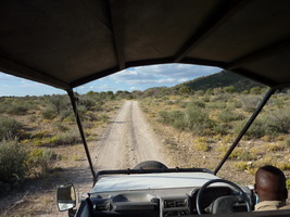 im offenen Landrover ein Stück vom Camp weg. Dann packt er Funkempfänger